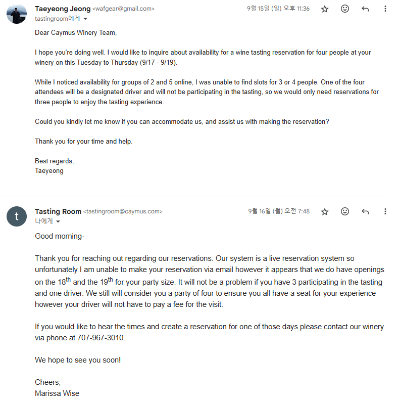어쨌든 케이머스는 여타 와이너리와 비슷하게 웹사이트(Tock)에서 예약을 할 수 있었는데, 2인이랑 5인은 빈 슬롯이 있고 3인이나 4인은 없다고 나오길래 이메일로 문의했다. 그랬더니 가능한 날짜는 있는데 확정은 전화로 해야 한다고 답장이 와서 전화로 예약 완료. 전화할 때 투어비는 얼마냐고 물어봤더니 우리는 투어는 없고 테이스팅만 있다고 딱 잘라 정정해주더라. 가족들이랑 브런치 먹으러 가서 메뉴 나오는거 기다리는 시간동안 밖에 잠시 나가 전화로 예약하고 들어오려고 했는데, 뭔가 대화가 잘 안돼서 전화를 몇번 다시 거느라 시간이 끌렸다 ㅜㅜ.