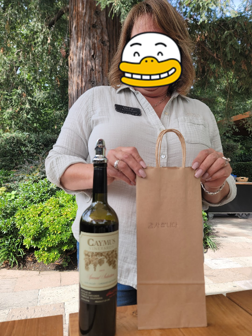 코스 진행해주시는 직원분 센스가 또 좋았던 점이 잔을 담는 종이백에 ‘감사합니다’ 라고 한글로 적어주시기도 하고, 와이너리에 직접 방문하면 시중에는 없는 진판델도 있다고 들어서 샵에 가면 살 수 있냐고 여쭤보니까 시음 리스트에 없는데도 병을 가져와 한잔 주시기도 했다.