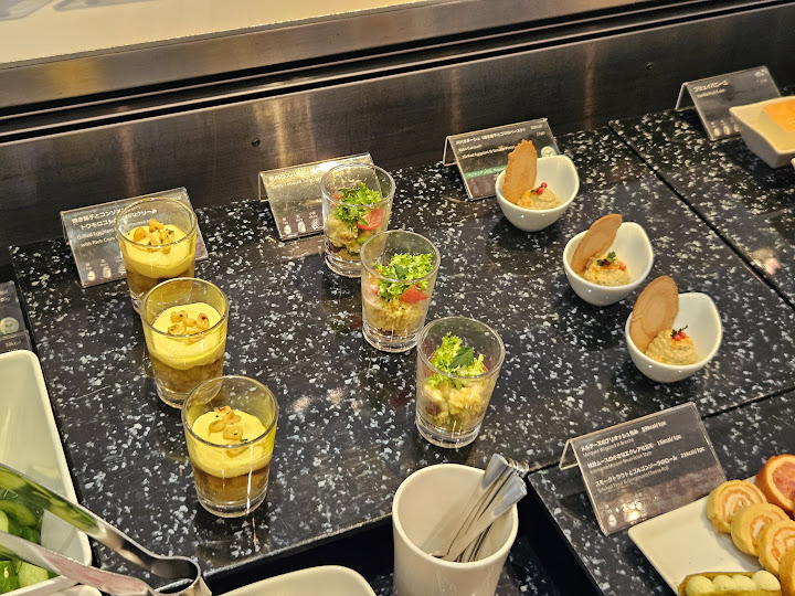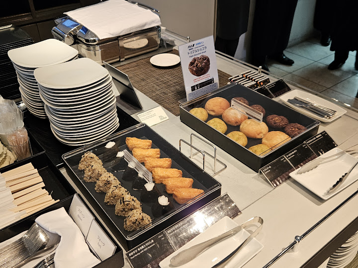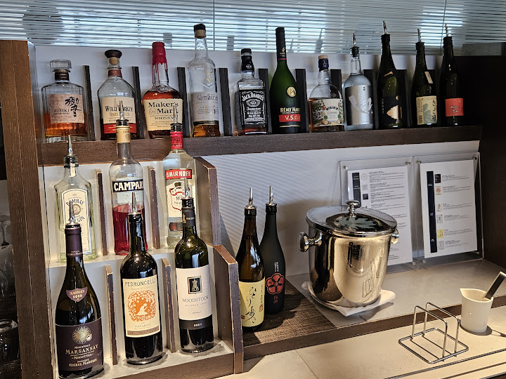 오후 1시반쯤 라운지에 도착하니 사람이 별로 없어서 최대한 촌티가 나지 않게 구경하느라 애먹었다! 다만 다른 사람들 일등석 탑승 후기에는 무슨 전담 직원이 와서 이것저것 추천도 해주고 관리도 해주고 한다고 해서 약간 긴장했는데, 그런건 없고 그냥 내가 앉은 자리에 물수건 하나 배달해주고 그 외 일절 상호작용이 없었다. 그냥 다른 라운지랑 비슷하게 음식 좀 있고 앉을 곳 좀 있고 이런 식이어서 아예 공간 자체가 다르다는 느낌은 받지 못했다.