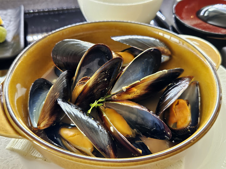 소바, 카레, 햄버거, 규동 등등이 있었는데 내가 메뉴판을 보며 고심하고 있자 조리사? 분께서 도와주셨다. 물론 일본어로... 대충 눈치껏 이거 이거가 제일 인기 메뉴다! 라고 설명해주셨고 내가 학부 교양 과목 하나에서 배운 짧은 일본어로 이거 양 많아요? 라고 하니까 양 별로 안많다고 다 먹을 수 있을 거라고 하셔서 용기 있게 스시와 홍합술찜을 시켰다. 실제로도 그렇게 많지 않았고. 그나저나 여기서 도와주신 조리사분이 일등석 여정 전체를 통틀어 가장 친절하셨다.